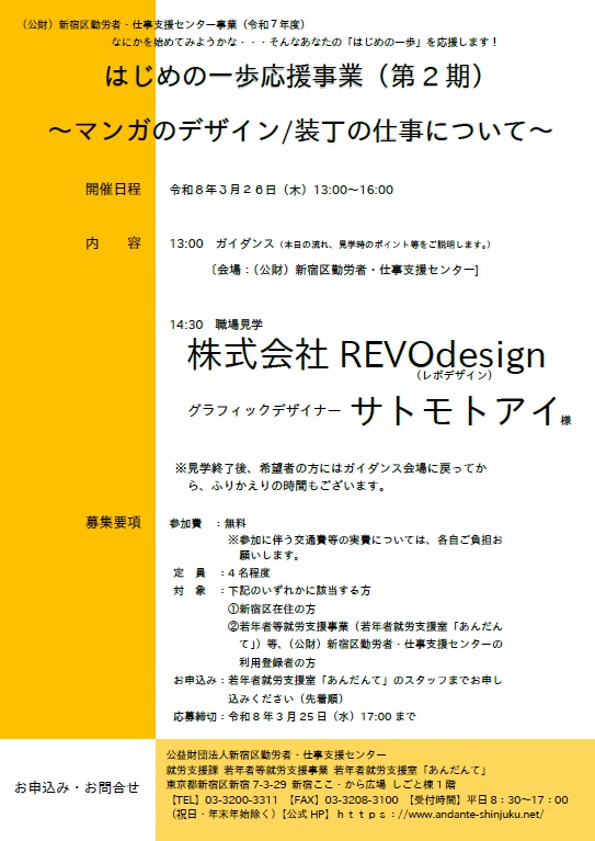 はじめの一歩応援事業(第2期)「職場見学『マンガのデザイン/装丁の仕事について』」を開催します。